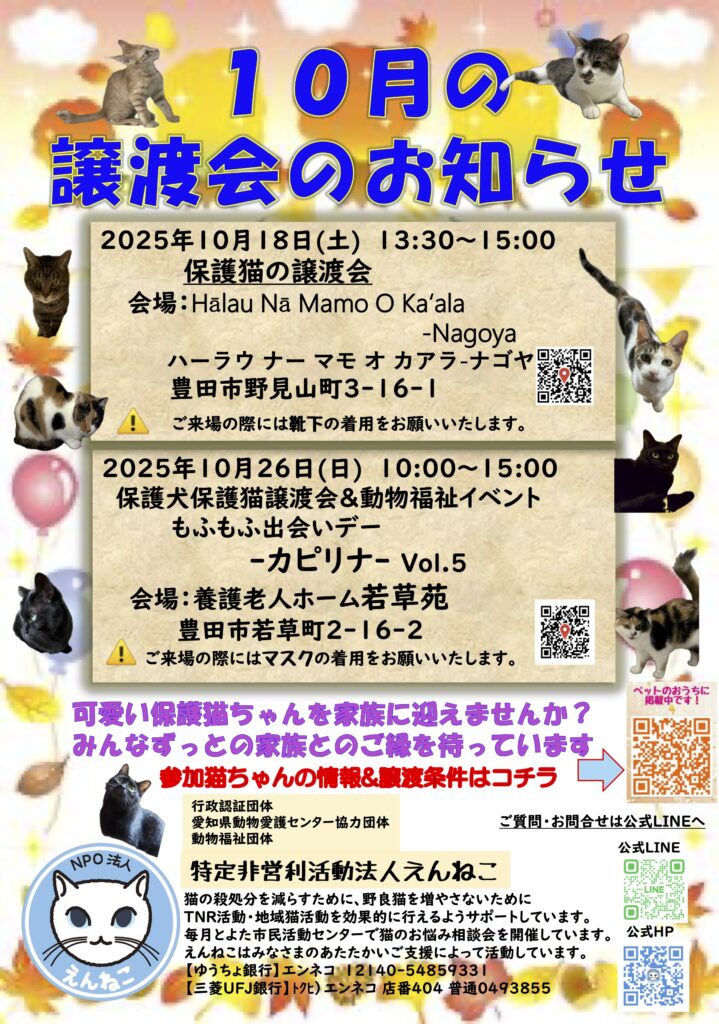・18日:譲渡会@ハーラウ ナー マモ オ カアラ – ナゴヤ